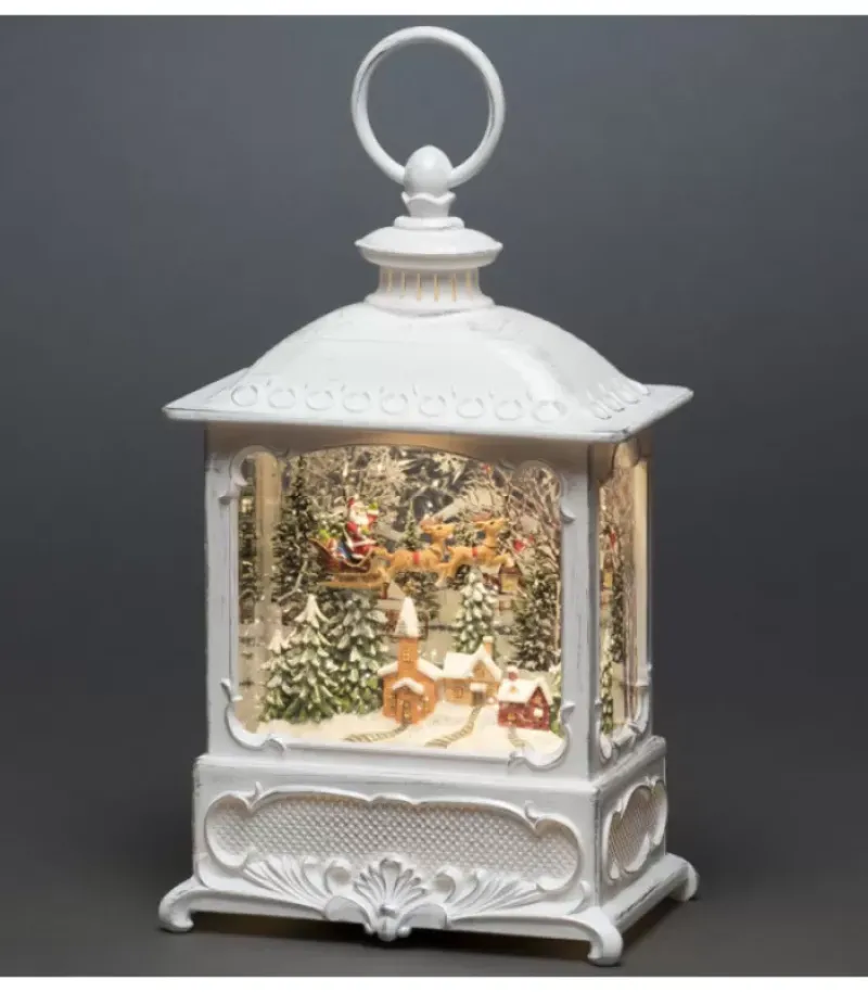 Petite Lanterne De Noël A Eau Avec Père Noël Volant Au-Dessus D’Un Village, Couleur Blanc Antique.