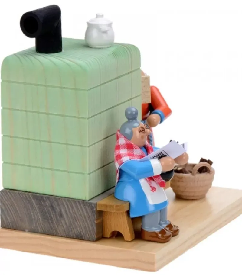 Poele En Faience Avec Grand-Mere Lisant Le Journal Et Grand-Père Qui Allume Le Feu.