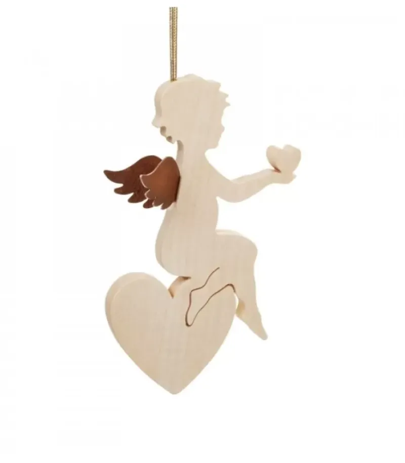 Petit Ange Décoratif A Suspendre, En Bois D’Erable, Assis Sur Un Grand Coeur Avec Ailes En Metal Oxyde Laque.