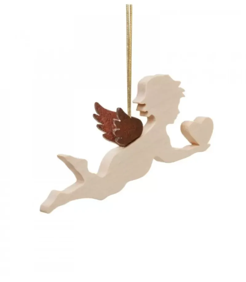 Petit Ange Décoratif A Suspendre, En Bois D’Erable, Tenant Un Coeur Dans Ses Mains Avec Ailes En Metal Oxyde Laque.