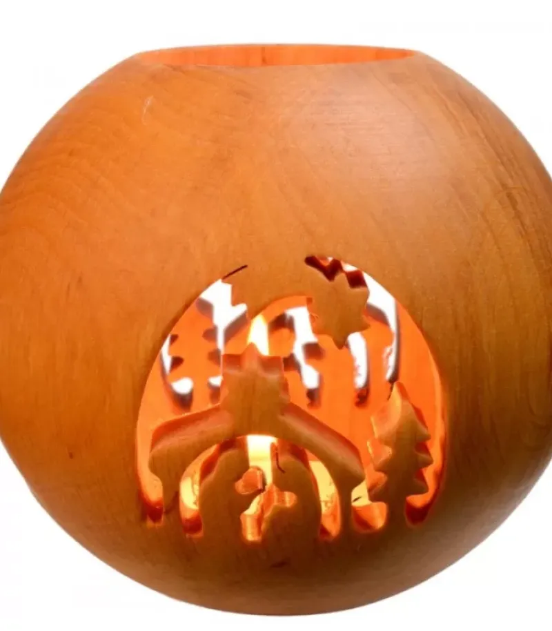 Photophore En Bois Naturel De Forme Ronde Avec Une Crèche De Noël Découpee Et Une Etoile Sur Les 2 Autres Faces.