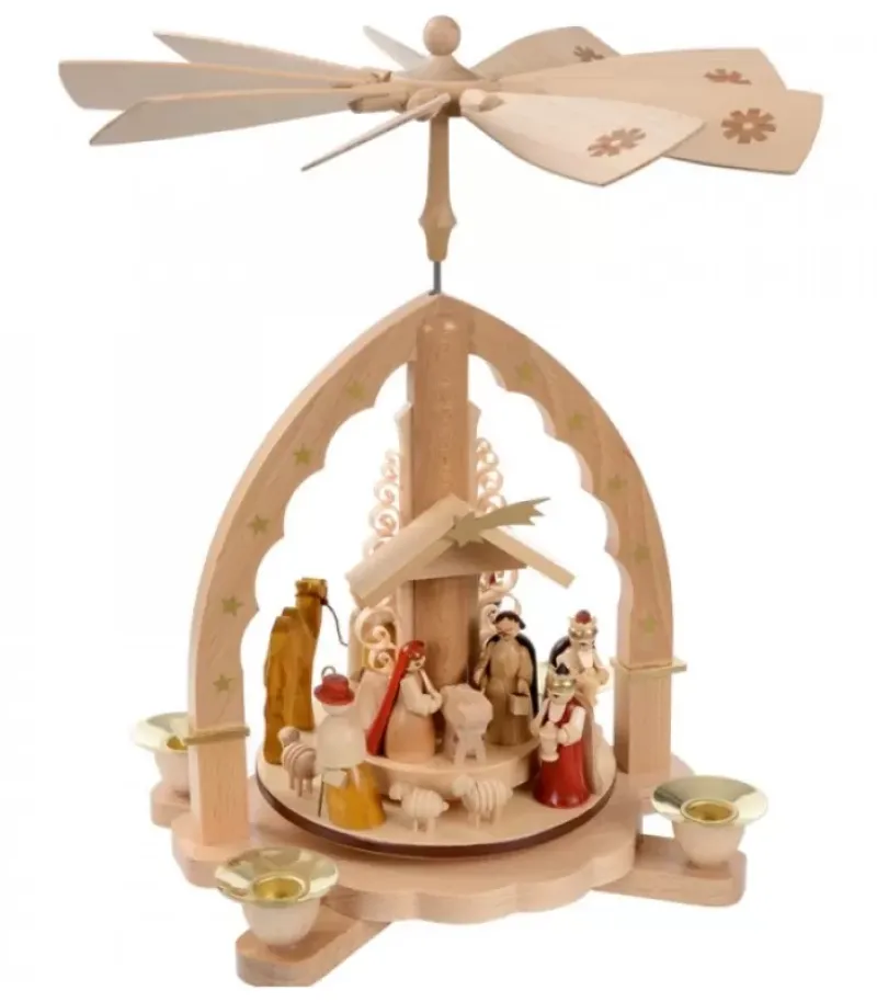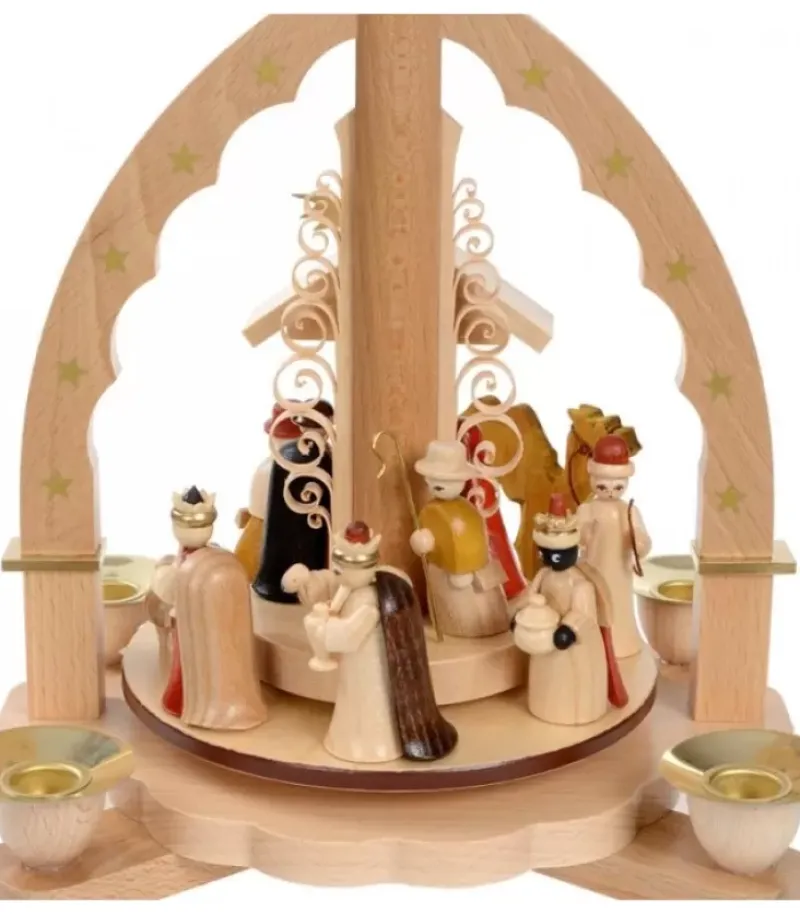 Pyramide En Bois Allemande En Forme D’Arche En Bois Naturel Avec Personnages De La Crèche De Noël Complete.