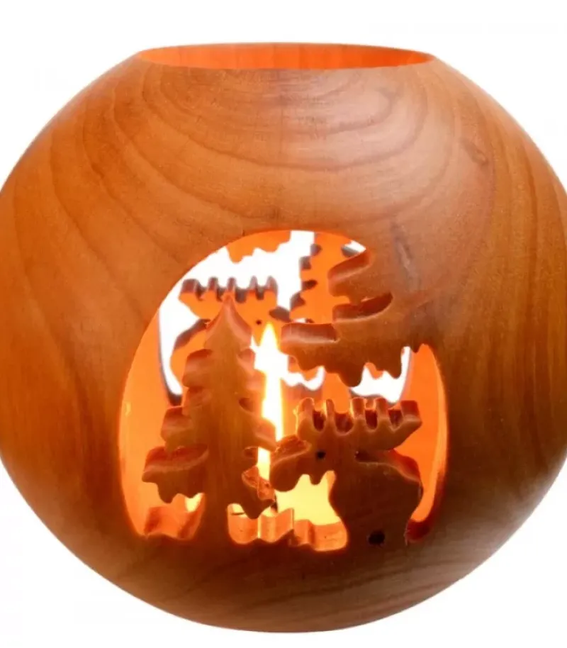 Photophore En Bois Naturel De Forme Ronde Avec Un Elan Dans La Foret Découpe Et Une Etoile Sur Les 2 Autres Faces.